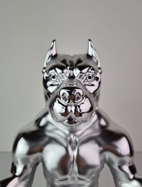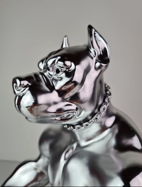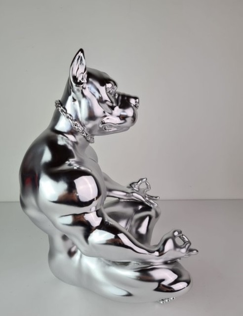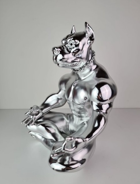 Een exclusieve popart-sculptuur van de internationaal erkende Italiaanse kunstenaar Sagrasse. Uitgevoerd in zilverkleurige hars met marmerstof, handgesigneerd en voorzien van een certificaat van echtheid.
