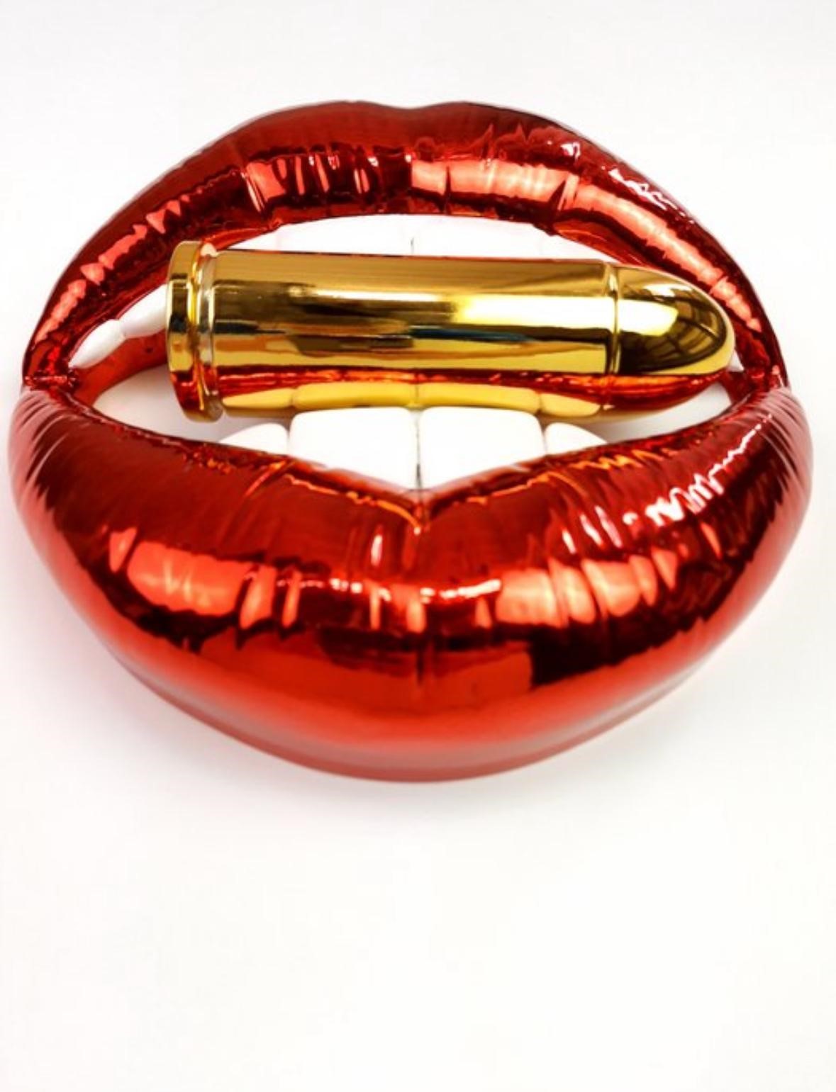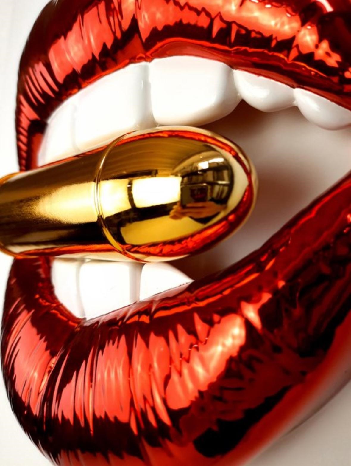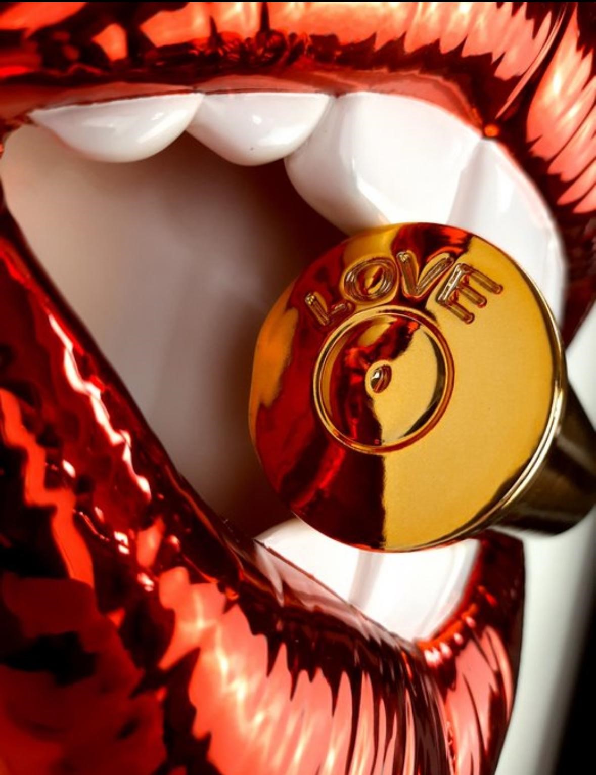 Een moderne en expressieve sculptuur van de Italiaanse kunstenaar Sagrasse, uitgevoerd in glanzend rood met witte en gouden accenten.