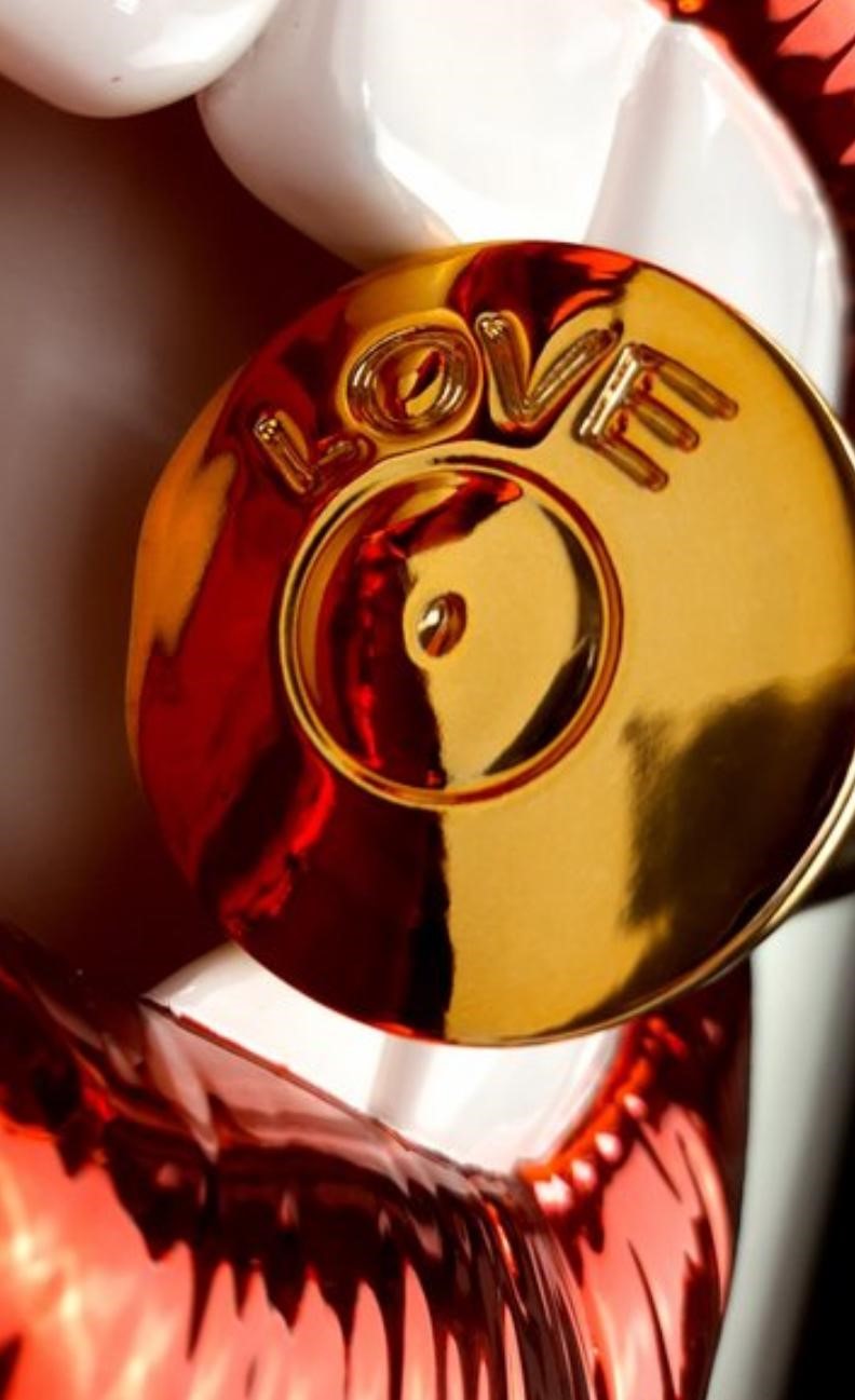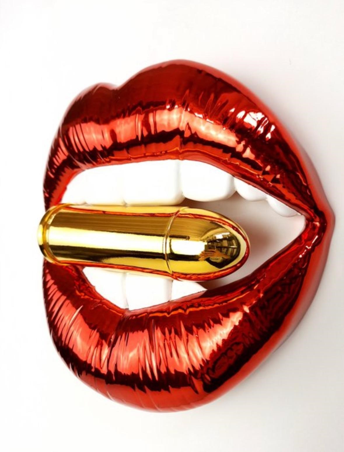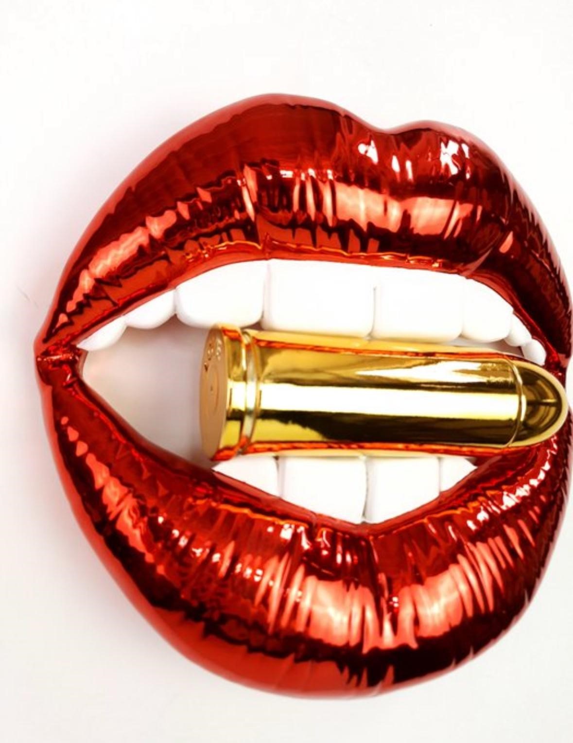 Een moderne en expressieve sculptuur van de Italiaanse kunstenaar Sagrasse, uitgevoerd in glanzend rood met witte en gouden accenten.
