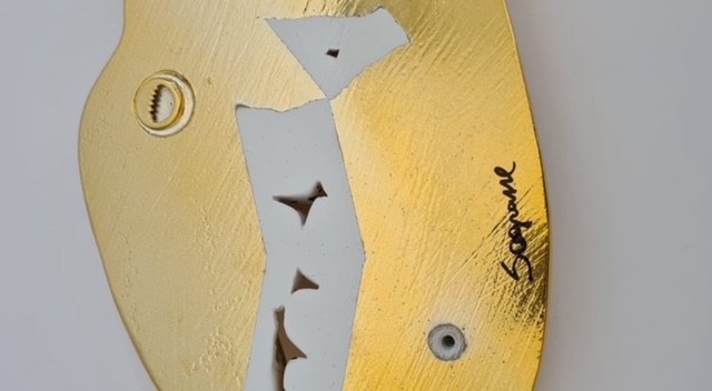 Vervaardigd uit hoogwaardige hars en marmerstof, afgewerkt met een glanzende goudlook. De afmetingen (33 x 20 x 3 cm) maken het perfect geschikt voor aan de muur, in een kunsthoek of als opvallend statement piece in een modern interieur.