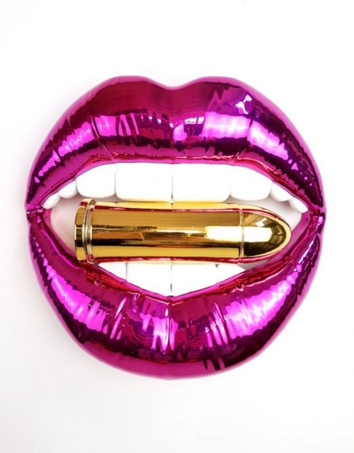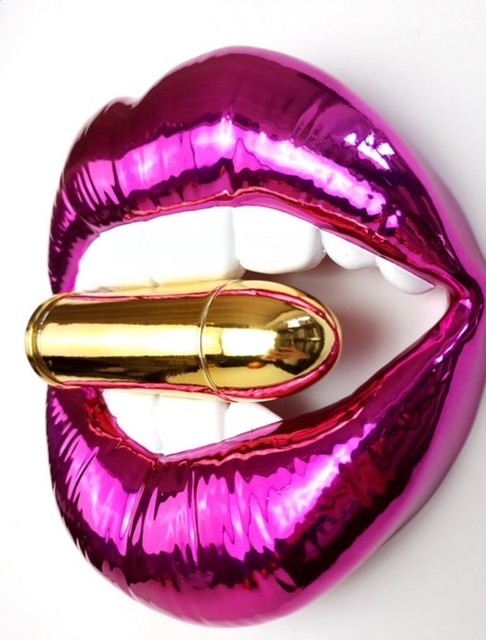 Een moderne en expressieve sculptuur van de Italiaanse kunstenaar Sagrasse, uitgevoerd in glanzend fuchsia met witte en gouden accenten.